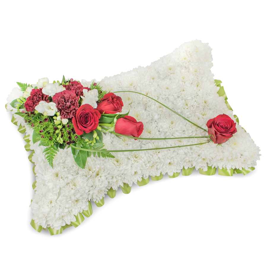 Share your heartfelt condolences with our exquisite sympathy bouquet, a true celebration of natural elegance. This arrangement features a harmonious mix of white chrysanthemums, red roses, white freesias, dark red carnations, dianthus, and bear grass. Every bloom is carefully hand-selected for its freshest quality and vibrant color.